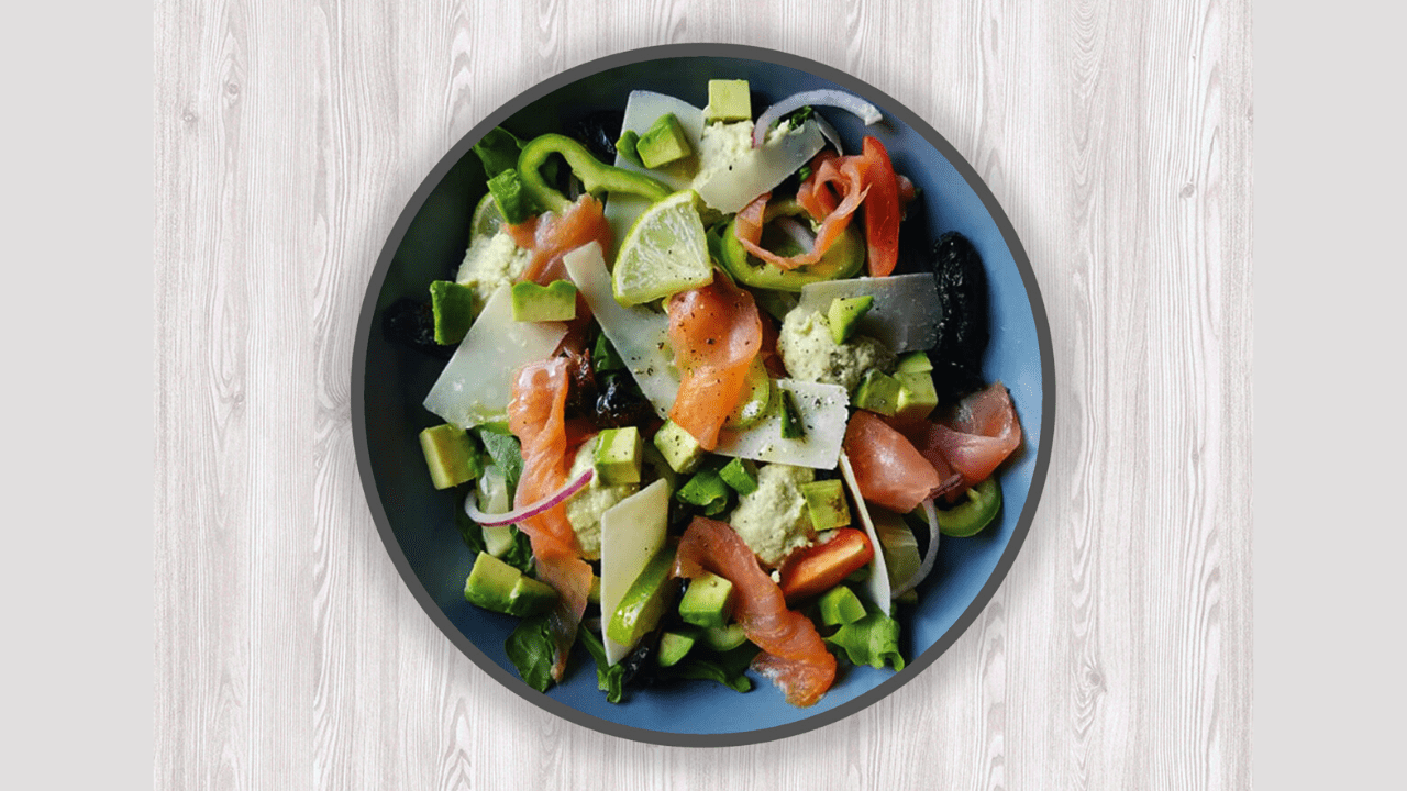 Sallatë, spinaq, avocado, domate, qepe e kuqe, salmon, spec, limon, qiqra ,kumbull e thatë, parmixhano, pesto
